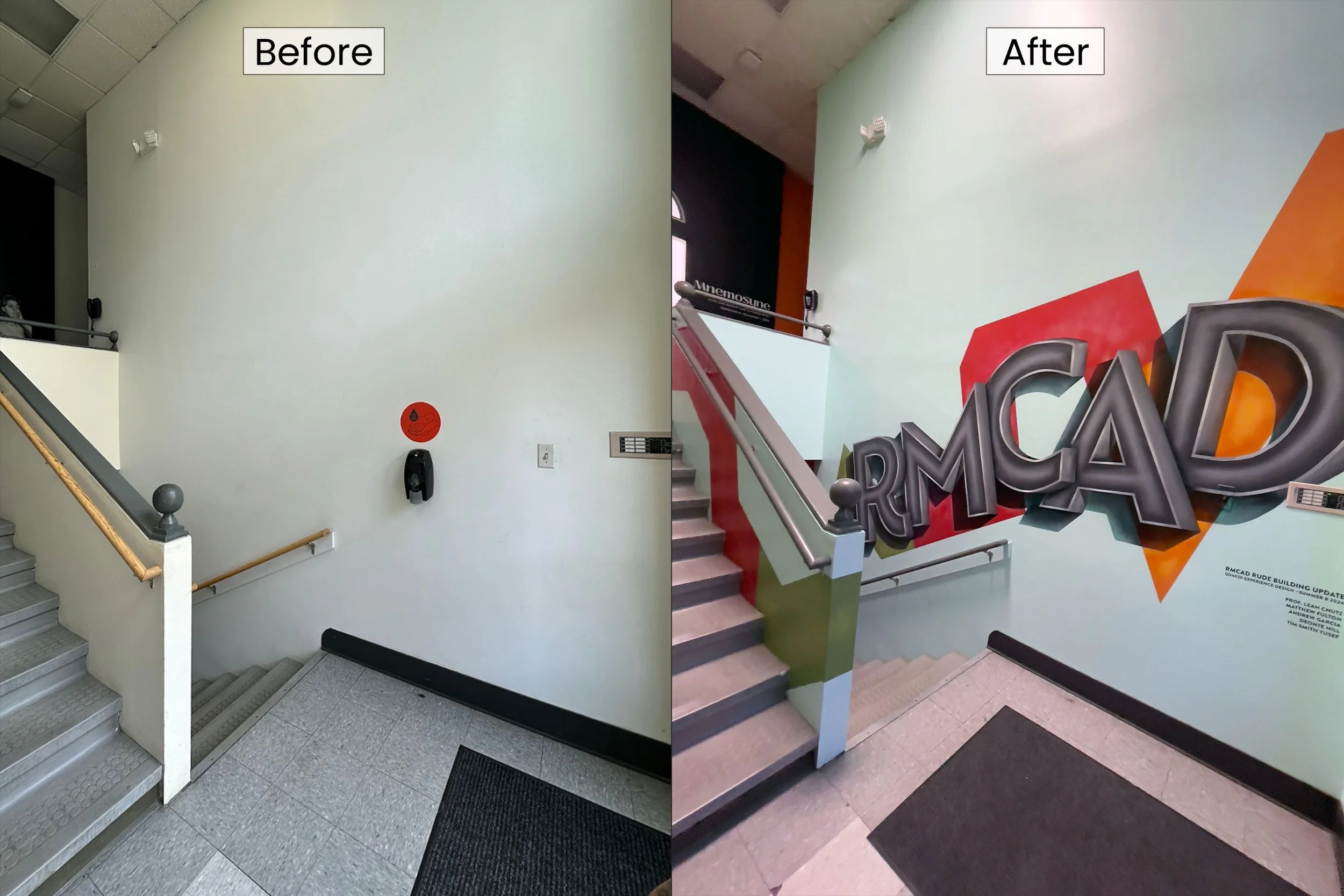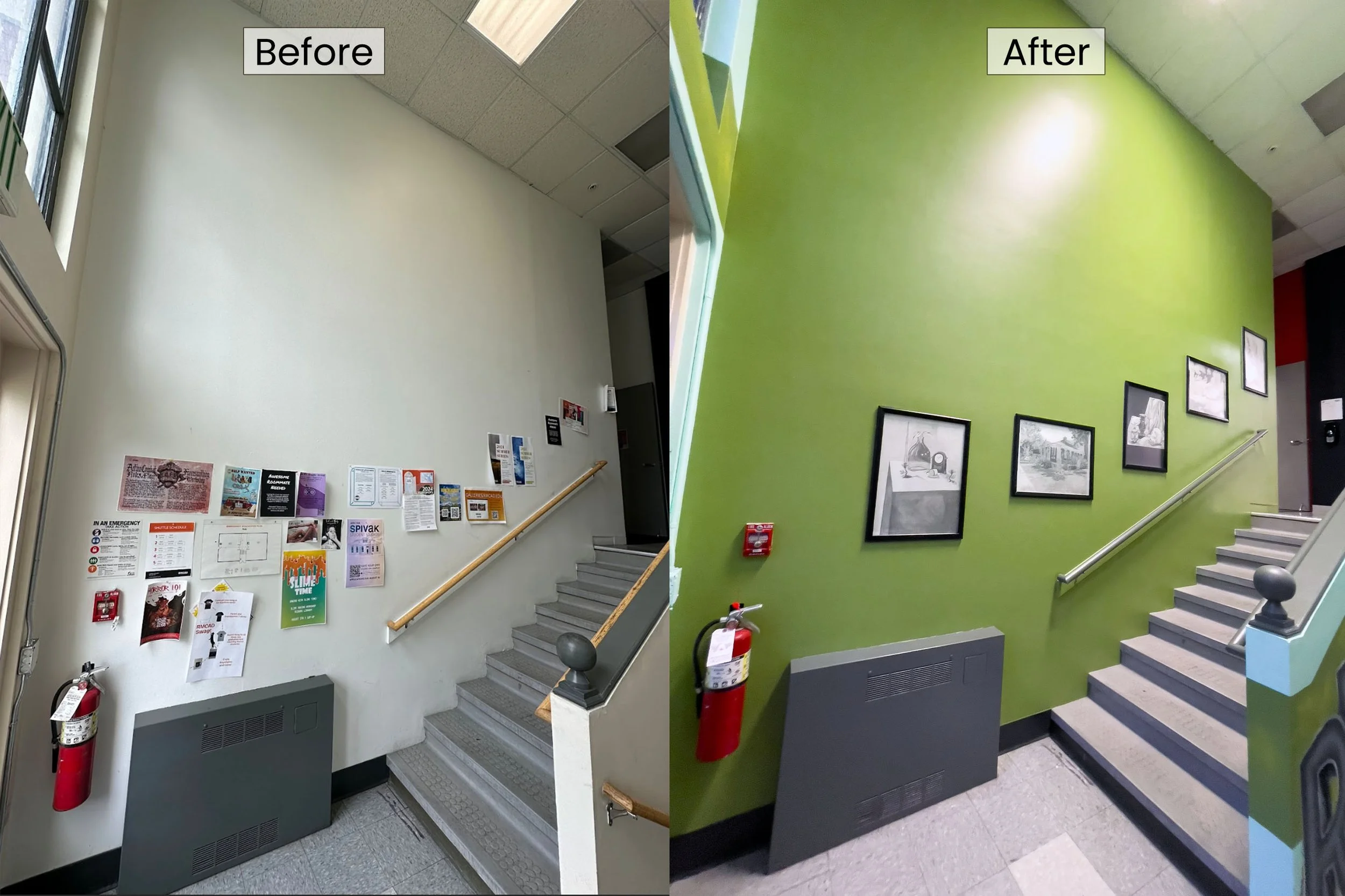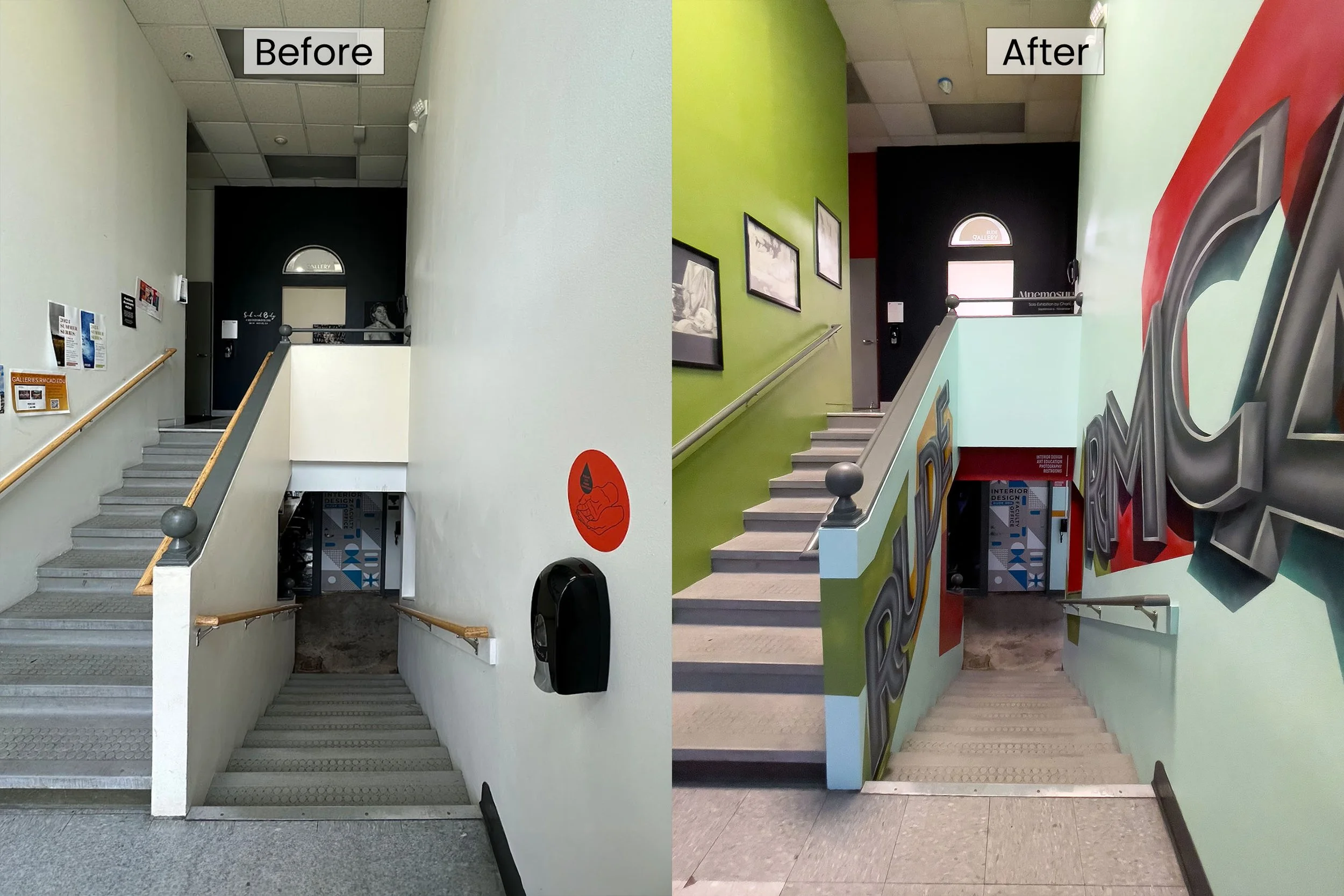 This project aimed to transform an overlooked corner of campus into a space that felt intentional and alive. I wanted the work to do more than decorate—it needed to energize the space and invite people in. One wall features a bold, hand-painted mural that brings movement and color to the structure, while the opposite side has been transformed into a gallery wall for rotating student artwork. This page includes the full journey—from design concepts and color studies to the final mural, along with a before-and-after comparison that showcases the transformation's impact.